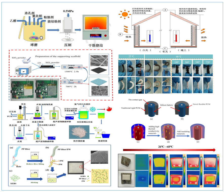 相变储能技术以相变材料为基础,具有储能密度大、输出温度和能量相对稳定优点。定形复合相变(CPCM)材料独有的性能使其具有广阔的应用前景。基于碳热还原反应制备SiC纳米线和SiC纤维碳热还原反应,提升相变材料的电阻率和导热性,解决传统CPCM在电子设备热管理应用的短路风险。调节氮化铝造孔烧结工艺参数,形成高比表面积和强吸附包裹能力的氮化铝多孔介质,解决传统CPCM吸附率低和导热系数差问题,使得CPCM应用范围更广,效果更显著。融合热塑性弹性体材料与PCM,赋予CPCM更高的柔性,降低接触热阻,扩展CPCM应用场景到不规则体。将CPCM与高发射材料进行结合,将CPCM场景从室内扩展到室外,实现被动式降温。中低温CPCM的制备工艺开发,实现园区用能电热双储灵活切换。