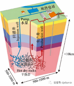 干热岩是埋藏于地下深处,温度大于150℃,不含或含少量流体的致密不渗透的高温热岩体,主要为变质岩或结晶岩类岩体。它们埋藏浅,温度在150℃以上,其热能赋存于岩石中,被认为是极具战略潜力的替代性清洁能源。干热岩也是一种地热资源。但是,干热岩是属于温度大于150℃的高温地热资源,而且其性质和赋存状态有别于蒸汽型、热水型、地压型和岩浆型的地热资源。干热岩的成分可以变化很大,绝大部分为中生代以来的中酸性侵入岩,但也可以是中新生代的变质岩, 甚至是厚度巨大的块状沉积岩。干热岩主要被用来提取其内部的热量, 因此其主要的工业指标是岩体内部的温度。