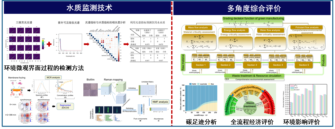 针对水污染控制过程,构建多种基于光谱的环境微观界面过程的检测方法以及水质监测技术,建立基于碳足迹、环境影响评价、成本最小化评价为基础的多角度综合评价体系。