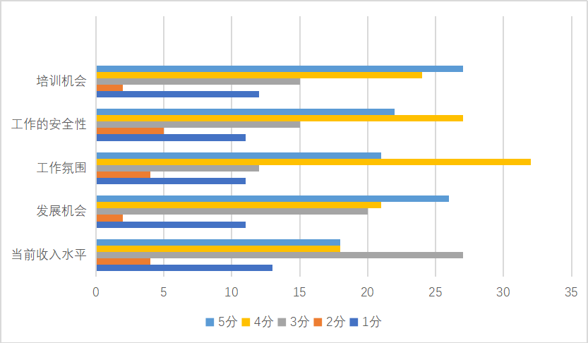 调查结果显示,已经就业的学生对目前的工作表示满意。其中,如图3.9所示,已经就业的毕业生对目前工作的培训机会、发展机会满意度较高。
