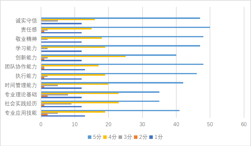 通过表3.12“用人单位对我院毕业生的基本评价”可知,各单位对我院毕业生持认可的态度,特别是学习能力、人际沟通能力、团队协作精神和承受坐着与失败能力等方面都给予好评,但是创新能力和组织管理能力还是有待提高,这也对今后在校生的培养侧重点提出了可参考的建议。