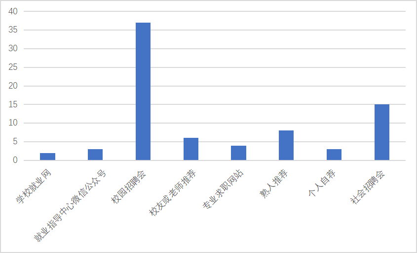 统计显示,我院已就业的毕业生中,获得工作的主要渠道为校园招聘会,其次依次为社会招聘会、专业求职网站、熟人推荐、校友或老师推荐等。因此,在今后的工作中,我们要一如既往的重视校园招聘,并注重开发新的就业渠道,为学生提供更多的就业机会。