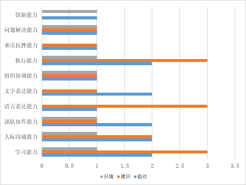 2018 届毕业生就业工作结束后,我院通过接待用人单位招聘、寒假期间走访用人单位、毕业生等途径,积极了解用人单位和毕业生(校友)对我院人才培养、就业教育等工作的意见建议,调查并总结了单位招聘时注重的毕业生能力,其中包括学习能力、创新能力、人际沟通能力、团队协作能力等。由下表可知,建环专业招聘单位更为注重学习能力、语言表达能力、执行能力;能动专业较为注重学习能力、团队协作能力、人际沟通能力、文字表达能力、执行能力;环境工程专业注重学生综合能力,可以得出结论,在校生应注重培养自主学习能力,锻炼自己的语言表达能力,加强团队协作,有合作意识,为以后的就业打下良好的基础。