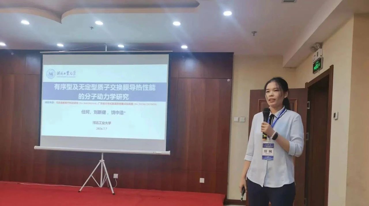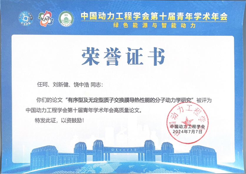 硕士研究生任珂在会上以《有序型及无定型质子交换膜导热性能的分子动力学研究》为题进行了口头汇报,介绍了质子交换膜微纳尺度传热方面的研究工作。该论文被评为中国动力工程学会第十届青年学术年会高质量论文。