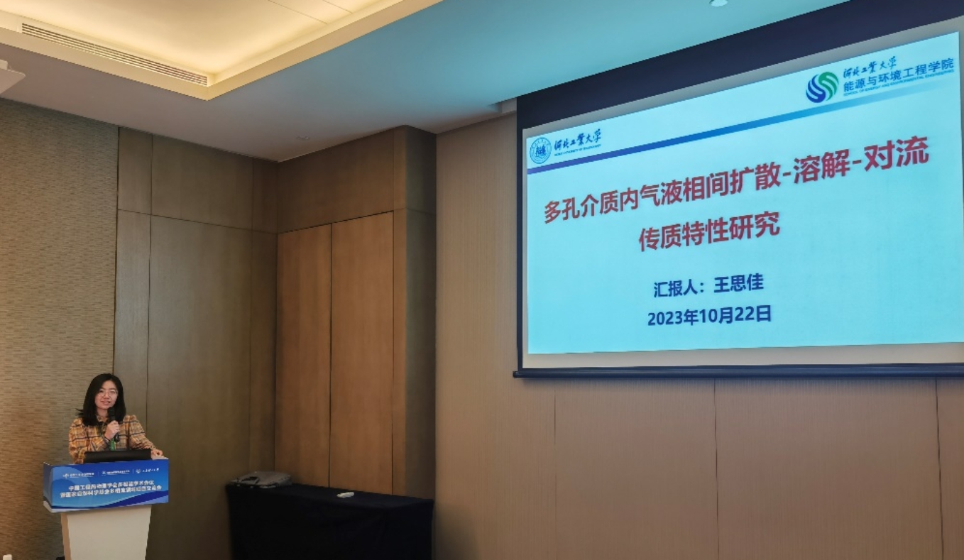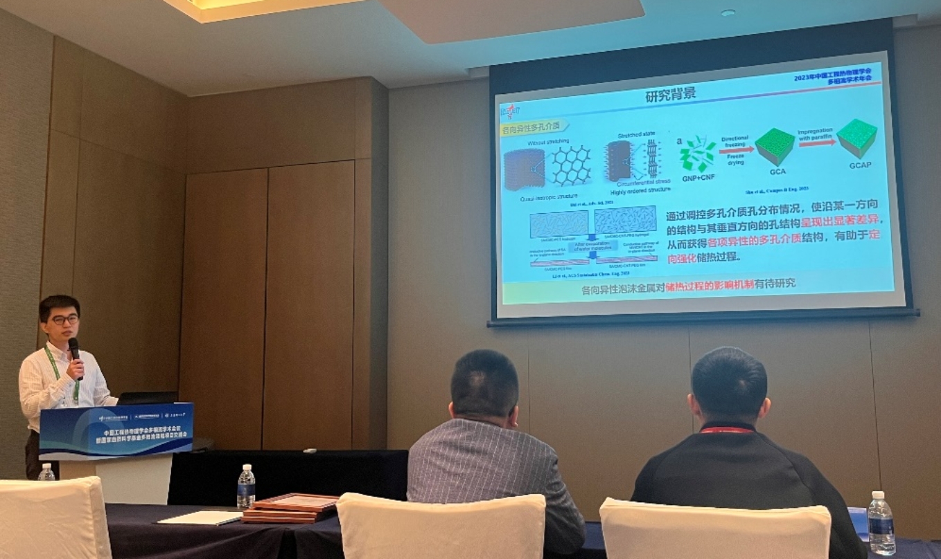 会上新能源与储能技术研究所岳远贺副教授受邀担任气液两相流与沸腾传热传质(二)分会场主席。在新能源多相流分会场,李宏阳老师做了题为“各向异性泡沫金属对固液相变传热和对流换热的影响机制研究”的学术报告,向大家介绍了各向异性泡沫金属强化潜热储热过程中导热和对流换热机制;在氢能与多能融合分会场,王思佳老师做了题为“碳氢封存过程中气液相间扩散-溶解-对流传质特性研究”的学术报告,针对“双碳”背景下的大规模深地储能技术,呈现了一些强化CO2利用效率等关键问题上的系列创新性成果;在先进核能与反应堆热工分会场,杨柳老师做了题为“变形超弹性球体入水能量响应及抗冲击特性研究”的学术报告,汇报了超弹性体入水过程的结构体变形行为引起的能量转化及抗冲击特性。