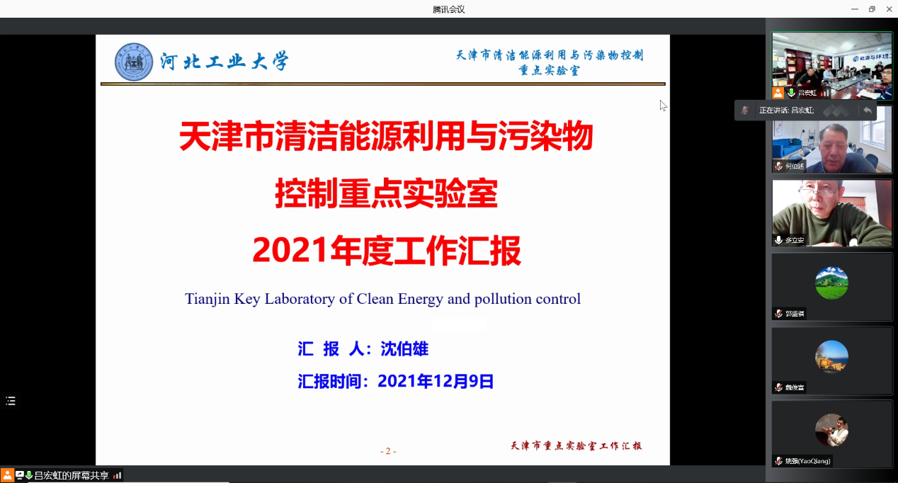 2021年12月9日,天津市清洁能源利用与污染物控制重点实验室2021年度学术委员会会议通过视频会议方式线上召开。学术委员会委员和专家姚强教授、尧命发教授、孙绍增教授、向军教授、魏俊富教授、漆新华教授、何伯述教授、多立安教授出席了会议,实验室主任沈伯雄教授、实验室副主任吕宏虹、h视频 院长助理兼实验室秘书杨建成、环保系主任张芝昆等实验室部分成员列席了会议。会议由姚强教授主持。