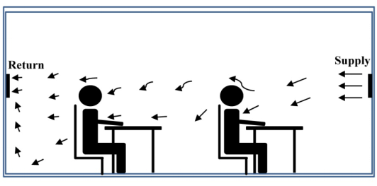其气流组织形式的最大特点是“三明治”分布:人员的头-胸水平层内(呼吸区域)形成新鲜空气层式区域。室内温度呈层状分布,呼吸区为相对低温空气区,底层为准滞区,呼吸区的空气品质较上、下层空间好。由于层式通风存在无明显吹风感、热舒适度高、高效、节能等优点,层式通风在我国有着较好的应用前景。