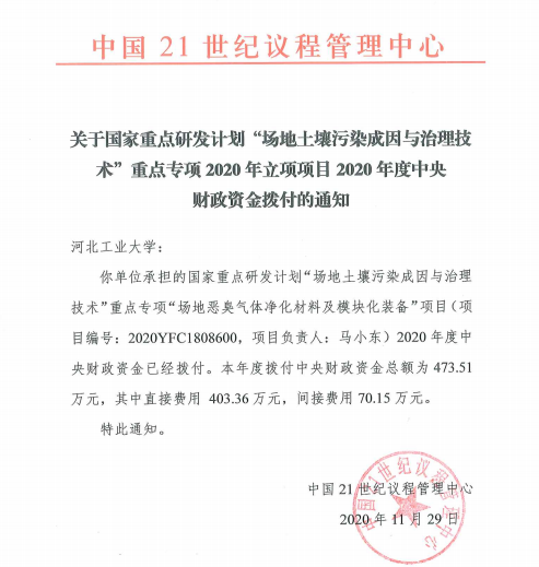 近日,国家科技部公布了国家重点研发计划“场地土壤污染成因与治理技术”重点专项2020年度项目立项结果,我校h视频 马小东教授牵头申报的“场地恶臭气体净化材料及模块化装备”项目获批立项(项目编号:2020YFC1808600),项目总经费1947万元,其中中央财政经费947万元。该项目是我国“场地土壤污染成因与治理技术”重点专项启动3年以来,我省在该领域获批的首个项目。