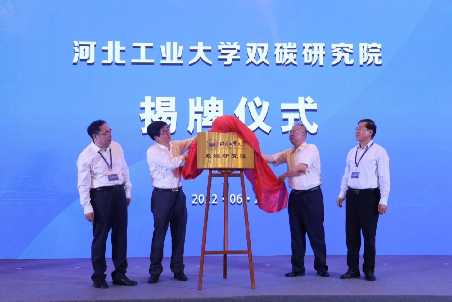 6月25日,第六届世界智能大会“推动高校科技成果转化,促进科技经济融合发展高端论坛”上,我校双碳研究院举行揭牌仪式。校党委书记韩旭、天津市科协党组成员一级巡视员卢双盈、我校副校长马国伟与市工信局副局长谷云彪共同为“河北工业大学双碳研究院”揭牌。h视频 行政主要负责人饶中浩、副院长闵春华出席仪式。