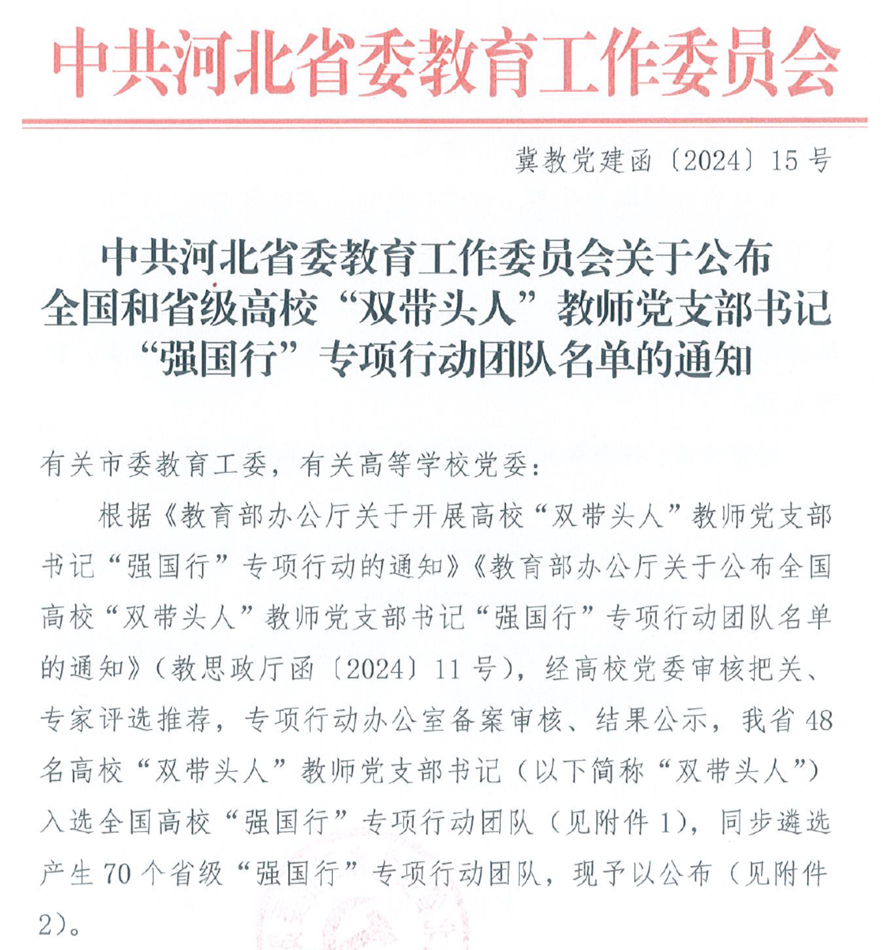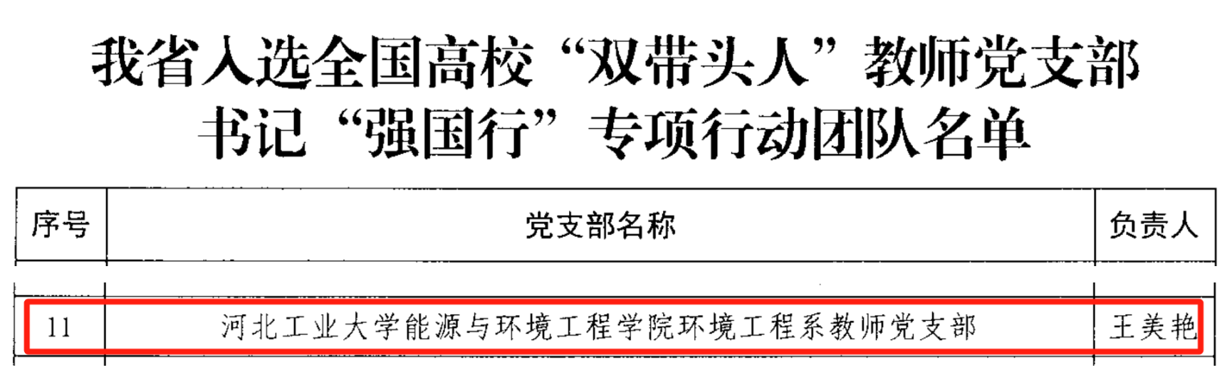 近日,教育部办公厅和河北省委教育工作委员会发布了《关于全国高校“双带头人”教师党支部书记“强国行”专项行动团队名单的通知》,河北工业大学h视频 环境工程系教师党支部成功入选全国高校“双带头人”教师党支部书记“强国行”专项行动团队。
